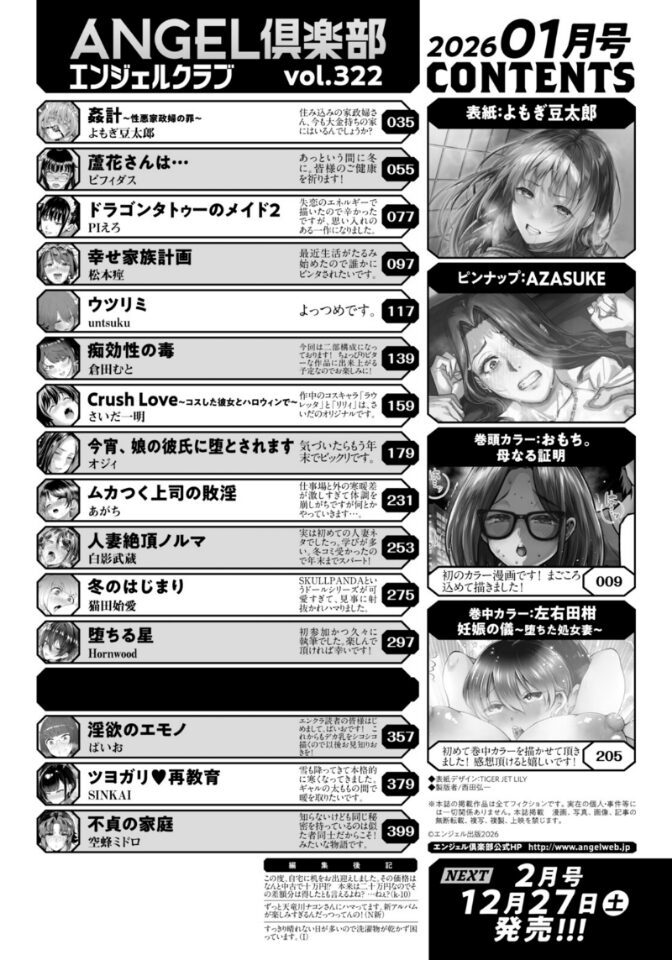 圧倒的巨乳コミック誌、『ANGEL倶楽部』。 ハードセックスのカリスマ≪よもぎ豆太郎≫による表紙が目印!! 掲載漫画も豪華におとどけ!!! 初の巻頭カラー≪おもち。≫をはじめ、注目の作家≪ビフィダス≫≪PIえろ≫≪オジィ≫など。 巻中カラー作品は≪左右田柑≫が担当!! 注目のピンナップはハードコアの真打≪AZASUKE≫が初参戦!! 初登場は≪ぱいお≫≪Hornwood≫!! 全17作品掲載★ 【豪華執筆陣】 おもち。/よもぎ豆太郎/ビフィダス/PIえろ/松本痙/untsuku/倉田むと/さいだ一明/オジィ/左右田柑/あがち/白影武蔵/猫田始愛/Hornwood/ぱいお/SINKAI/空蜂ミドロ