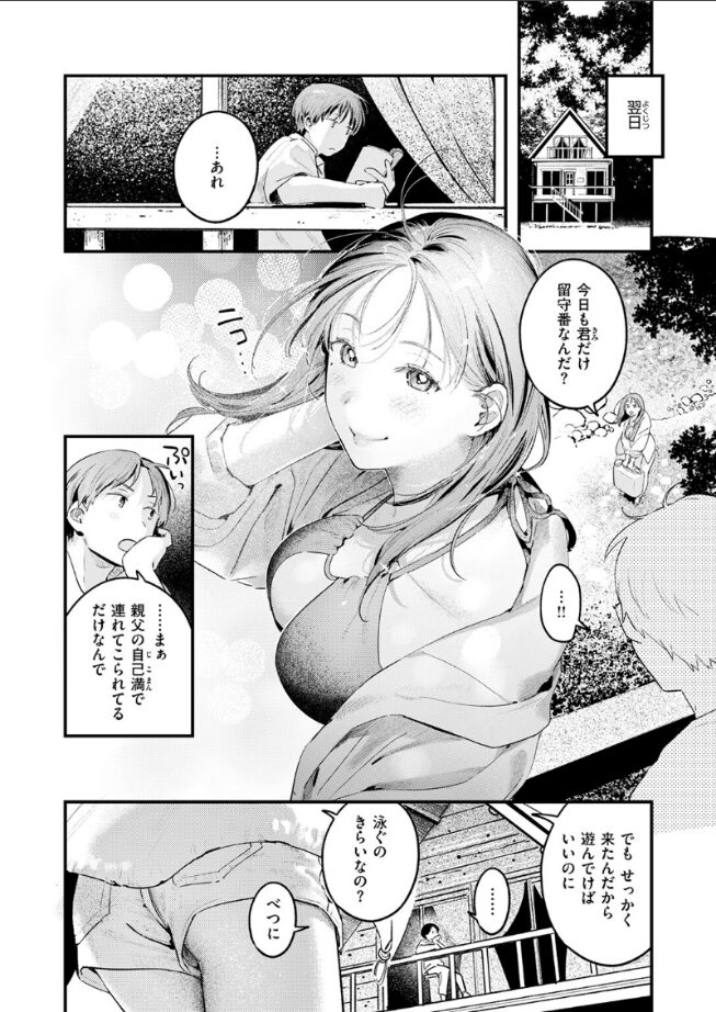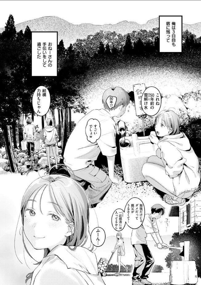 「バレちゃうかもしれないもんね?おち○ちん治療してもらったこと♪」毎年恒例となっている夏休みのアウトドア旅行。俺もガキじゃないんだし、父親の趣味に付き合うのは現地到着までだ。コテージ管理人のおねーさん、清凪(せな)さんは引きこもっている俺を気に掛けている模様。まあ、施設内の川くらいは…とテキトーに泳いでみたところ、ヒルがいっぱい潜むエリアに立ち入ってしまい、あろうことか局部に……。「こっちは…吸着しただけだったみたいね」怯むことなくおち●ちんの治療をしてくれたおねーさん。そんなこともあり、なんだか距離が近くなっていくのだった……。