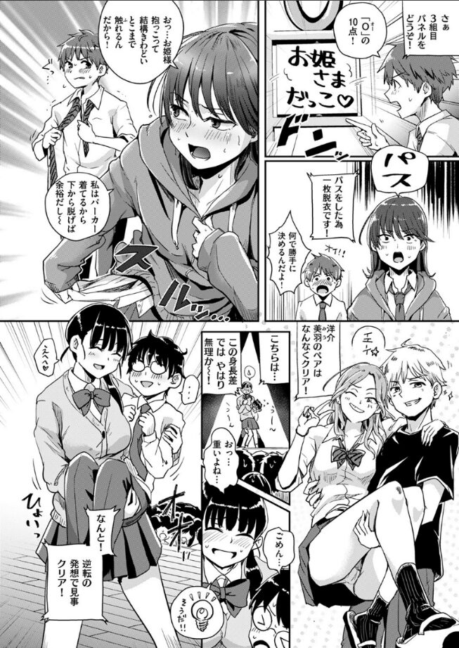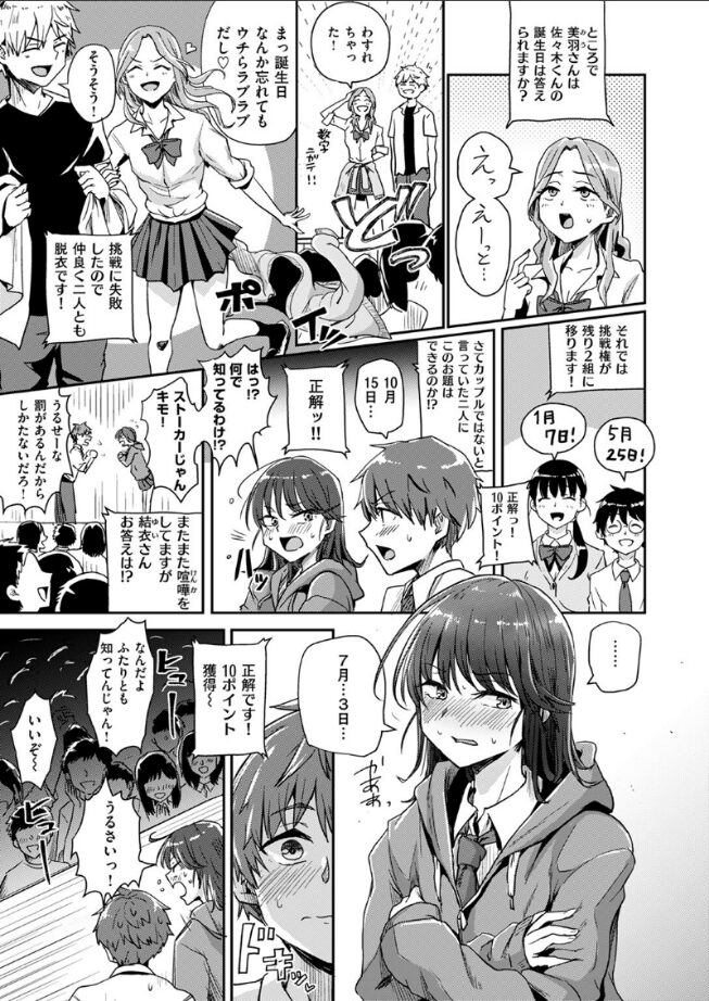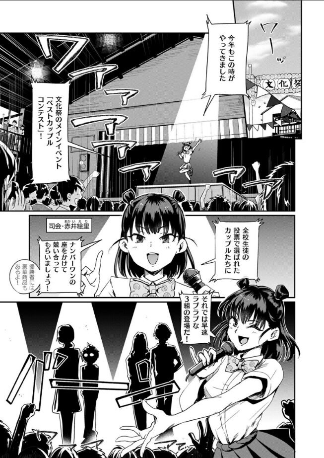 『ベストカップルコンテスト』とは、校内から選ばれたカップルたちが愛を試されながら競い合い、ナンバーワンを目指す文化祭のメインイベント!!そして付き合っていないのに、なぜかこのイベントに巻き込まれてしまった男女が一組……。しかも、お題をクリアしないとみんなの前で服を脱ぐ罰ゲーム付き。しかたなくチャレンジする二人だったが、お題は次々と《過激》になっていき……!?