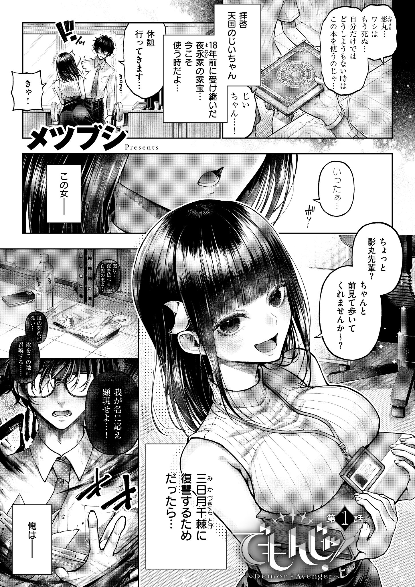 《エグゼ作品紹介②》 【メツブシ/でもんじゃ!〜Demon Avenger〜 第1話】 小悪魔後輩OL・千棘に復讐しようと悪魔・ベラノクスを召喚した影丸😈 ベラノクスに従う悪魔・キラミとチラミに頼み、千棘へ社会的復讐を企むも彼女が発情して⁉️ メツブシ先生が贈るアクマ的リベンジH連作が48Pの超大作で開幕⭐️