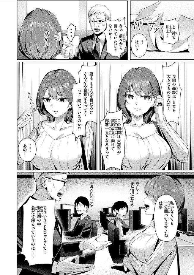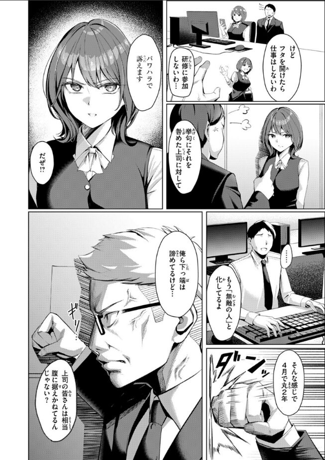 | 性処理課に配属されたOLの川上綺羅が同僚たちとセックスするストーリーです。 生意気な態度を取っていた綺羅がセックスの快楽に溺れて、少しずつ従順なメスになっていく様子が描かれていてストーリー性に魅力がありましたし、女性社員とのSMプレイも用意されていてHシーンのバラエティが豊かでした。 嫌いな上司にペニスをフェラさせられている時の綺羅の反抗的な視線に興奮しましたし、頭を押さえつけられて口内射精されている時の様子が大きく描かれていて迫力満点でした。 授乳手コキや、赤ちゃんプレイのシーンもエロかったですし仕事の鬱憤を晴らすように激しくバックでピストンされてアヘ顔になっている綺羅の姿が可愛かったです。 Hなボンテージ風の衣装を着てセックスする後半のHシーンもクオリティが高かったです。 |